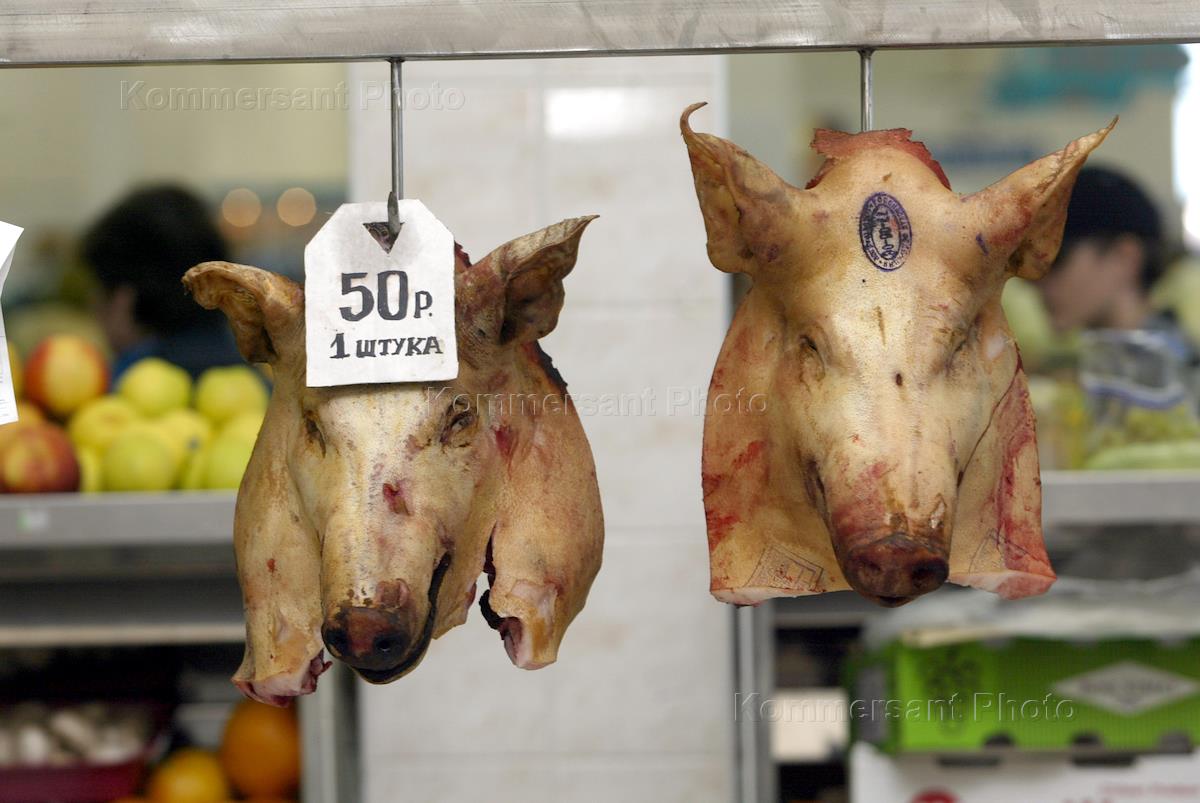 Свиные головы с ценником "50 р. 1 штуку" висят в магазине.