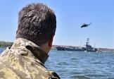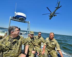 Рабочая поездка президента Украины Петра Порошенко в Николаевскую область. Президент Украины Петр Порошенко (слева) во время ознакомления с ходом тактических учений Военно-Морских Сил Украины.