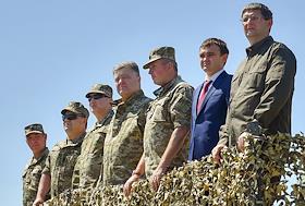 Рабочая поездка президента Украины Петра Порошенко в Николаевскую область. Секретарь СНБО Александр Турчинов (третий слева) и президент Украины Петр Порошенко (в центре) во время посещения 235 общевойскового полигона.
