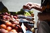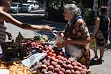 Жанровая фотография. Пожилая женщина покупает фрукты на базаре.