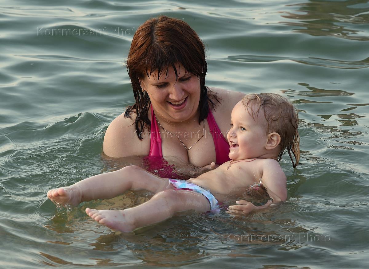 Жанровая фотография. Молодая мама с дочкой купаются в море.