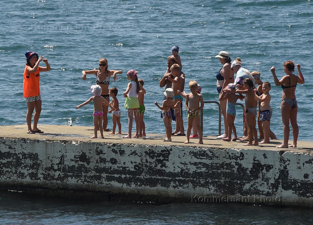 Жанровая фотография. Аниматор занимается гимнастикой с детьми на пляже у моря.