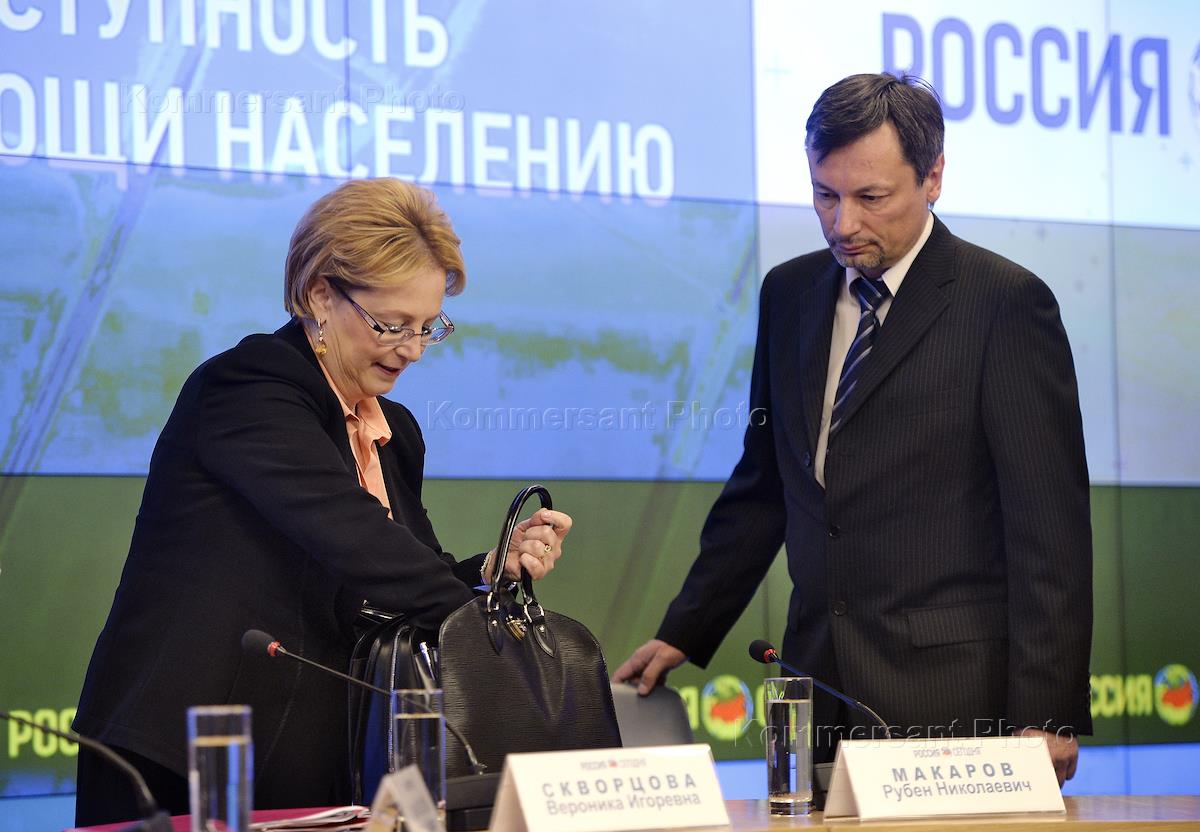 Министр здравоохранения России Вероника Скворцова (слева) и главный редактор Российского информационного агентства медико-социальной информации АМИ Рубен Макаров (справа) на пресс-конференции "Поликлиники России: качество и доступность амбулаторной помощи населению". Пресс-конференция прошла в Международном мультимедийном пресс-центре МИА "Россия сегодня".