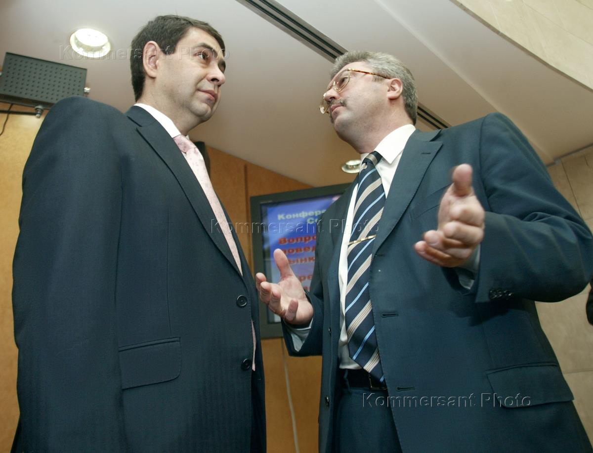Vice chairman of the Russian Federal Securities and Exchange Commission (FKCB) Gennady Kolesnikov (left) and FKCB chairman Igor Kostikov (right) take part in the conference headlined 'Corporate Behaviour in Financial Markets'. The conference was held in the Moscow Inter-Bank Currency Exchange (MMVB).