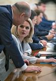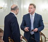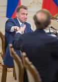 Министр строительства и жилищно-коммунального хозяйства России Михаил Мень (слева) и министр сельского хозяйства России Александр Ткачев (справа) перед началом совещания президента России Владимира Путиным с членами правительства России.