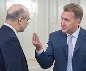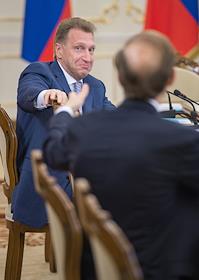 Министр финансов России Антон Силуанов (слева) и председатель правительства России Игорь Шувалов (справа) перед началом совещания президента России Владимира Путиным с членами правительства России.