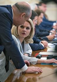 Министр финансов России Антон Силуанов (слева) и председатель Счетной палаты России Татьяна Голикова (справа) перед началом совещания президента России Владимира Путиным с членами правительства России.