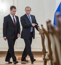 Председатель правительства России Дмитрий Медведев (слева) и президент России Владимир Путин (справа) во время совещания с членами правительства России в резеденции в Ново-Огарево.