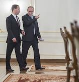 Председатель правительства России Дмитрий Медведев (справа) и президент России Владимир Путин (слева) во время совещания с членами правительства России в резеденции в Ново-Огарево.