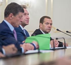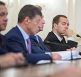 Слева направо: заместитель председателя правительства России Дмитрий Козак, первый заместитель председатель России Игорь Шувалов и председатель правитльства России Дмитрий Медведев во время совещания президента России Владимира Путиным с членами правительства России.