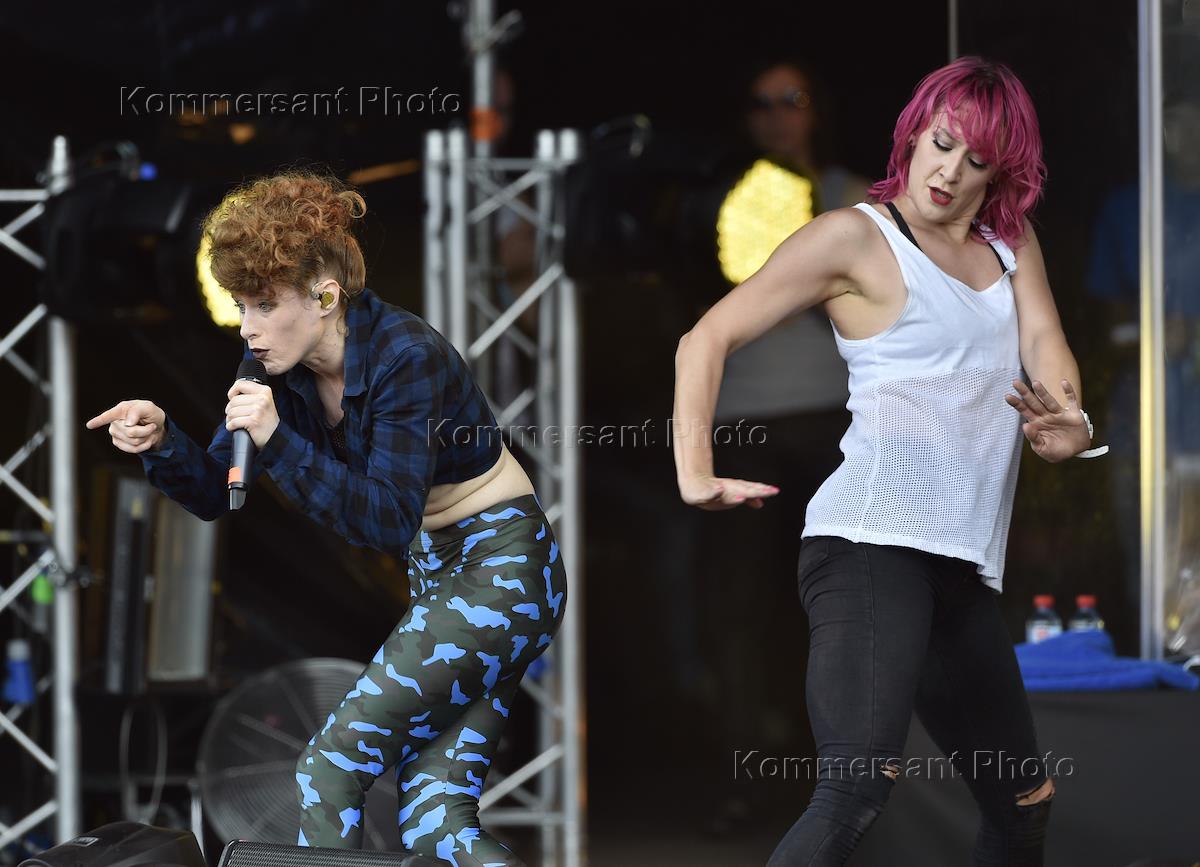Певица Kieza (слева) во время выступления на концерте музыкального фестиваля под открытым небом "Пикник Афиши 2015" на территории музея-заповедника "Коломенское".