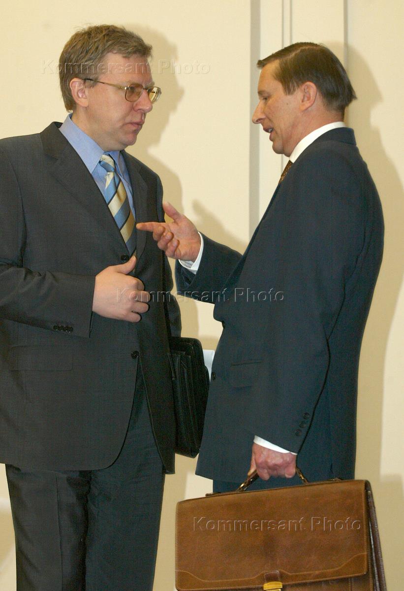 Russian Deputy Prime Minister, Finance Minister Alexey Kudrin (left) talks to Defence Minister Sergey Ivanov (right) at a government meeting.