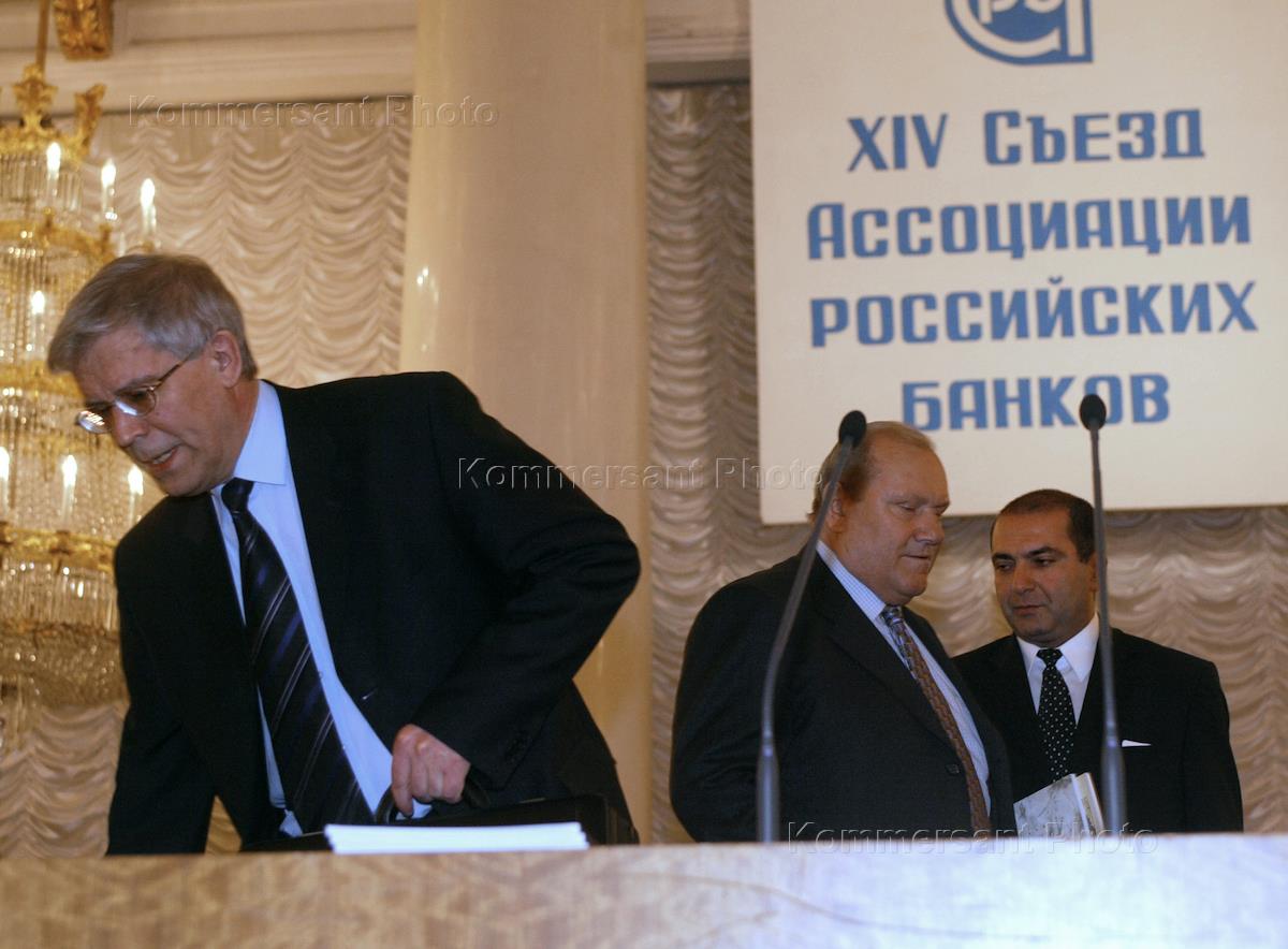 Председатель Центрального Банка России Сергей Игнатьев (слева), председатель Ассоциации российских банков (АРБ) Сергей Егоров и президент АРБ Гарегин Тосунян (справа) во время 14 съезда Ассоциации российских банков (АРБ). Съезд прошел в Колонном зале Дома союзов.