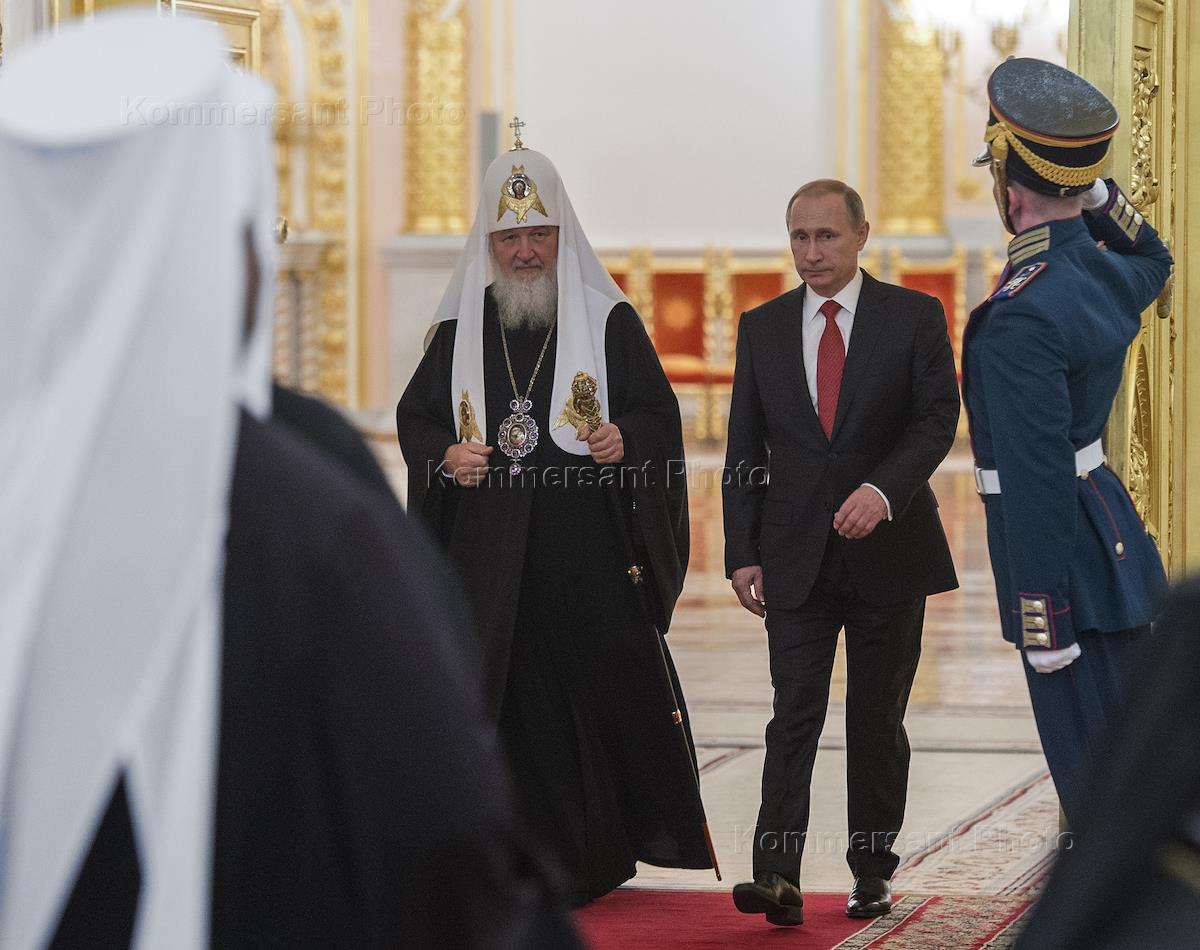 Патриарх Московский и всея Руси Кирилл (слева) и президент России Владимир Путин (справа) во время торжественного приема по случаю тысячелетия преставления святого равноапостольного князя Владимира. Прием прошел в Кремле.