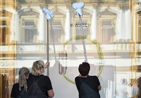 Витрина магазина Apple shop в ЦУМе с часами Apple Watch. Подготовка к церемонии открытию магазина.