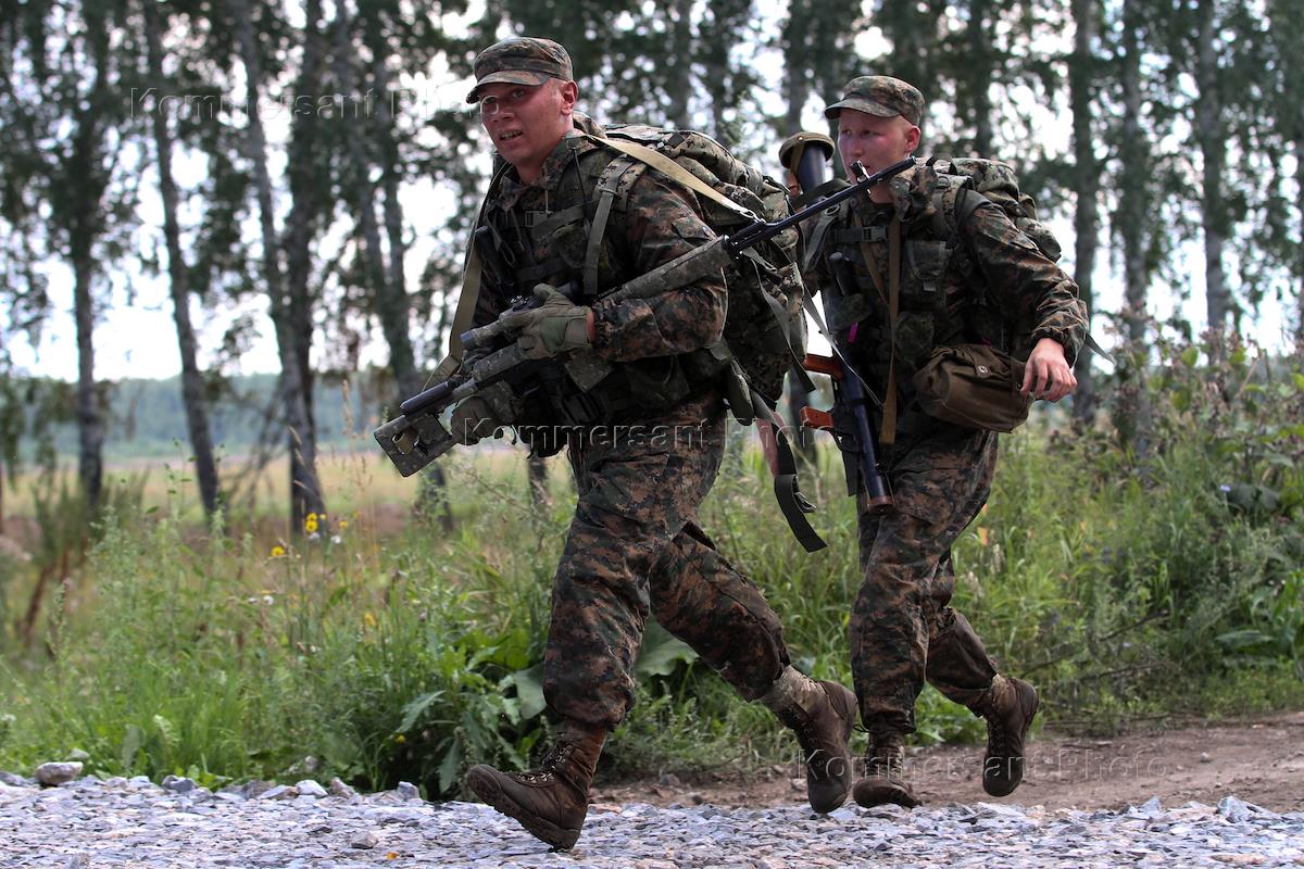 Военнослужащие российской армии во время первого этапа "Десантирование, совершение марш-броска" Всеармейского конкурса "Отличники войсковой разведки" в рамках проведения "Армейских Международных игр – 2015" на полигоне "Кольцово".