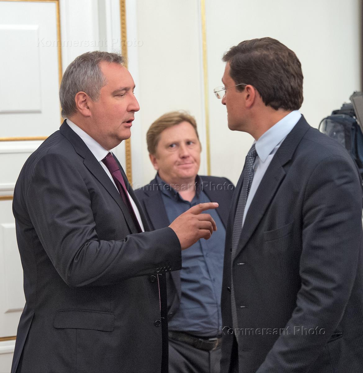 Заместитель председателя правительства России Дмитрий Рогозин (слева) и первый заместитель министра промышленности и торговли России Глеб Никитин (справа) перед началом совещания президента России Владимира Путина с членами правительства России в Ново-Огарево.