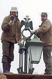 Рабочие ремонтируют уличный фонарь на Дворцовой площади перед празднованием 300-летнего юбилея Санкт-Петербурга.