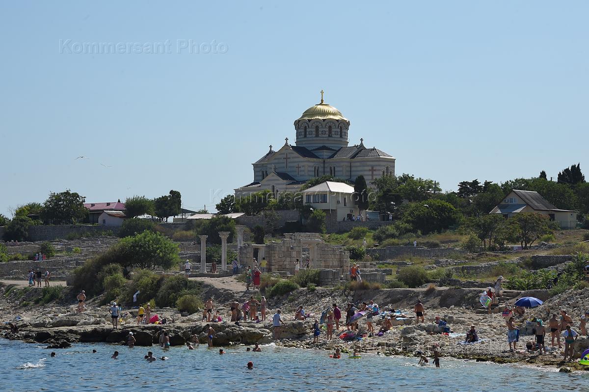 Собор Святого Владимира на территории заповедника "Херсонес Таврический". Отдыхающие на пляже.