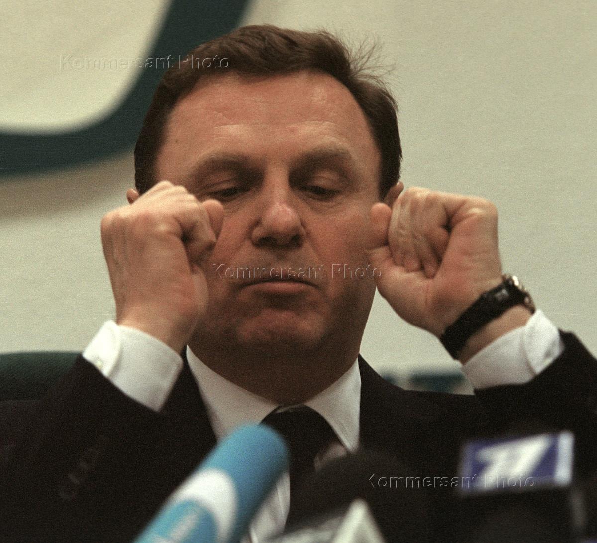 Председатель Социалистической партии России Иван Рыбкин на пресс-конференции "Всероссийская акция демократических сил "Это — мой кандидат". Пресс-конференция прошла в агентстве "Интерфакс".