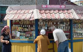 Виды города Пскова. Покупатели у продуктового ларька.