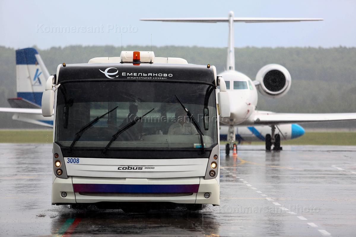 Виды города Красноярска. Международный аэропорт "Емельяново". Автобус для перевозки пассажиров.