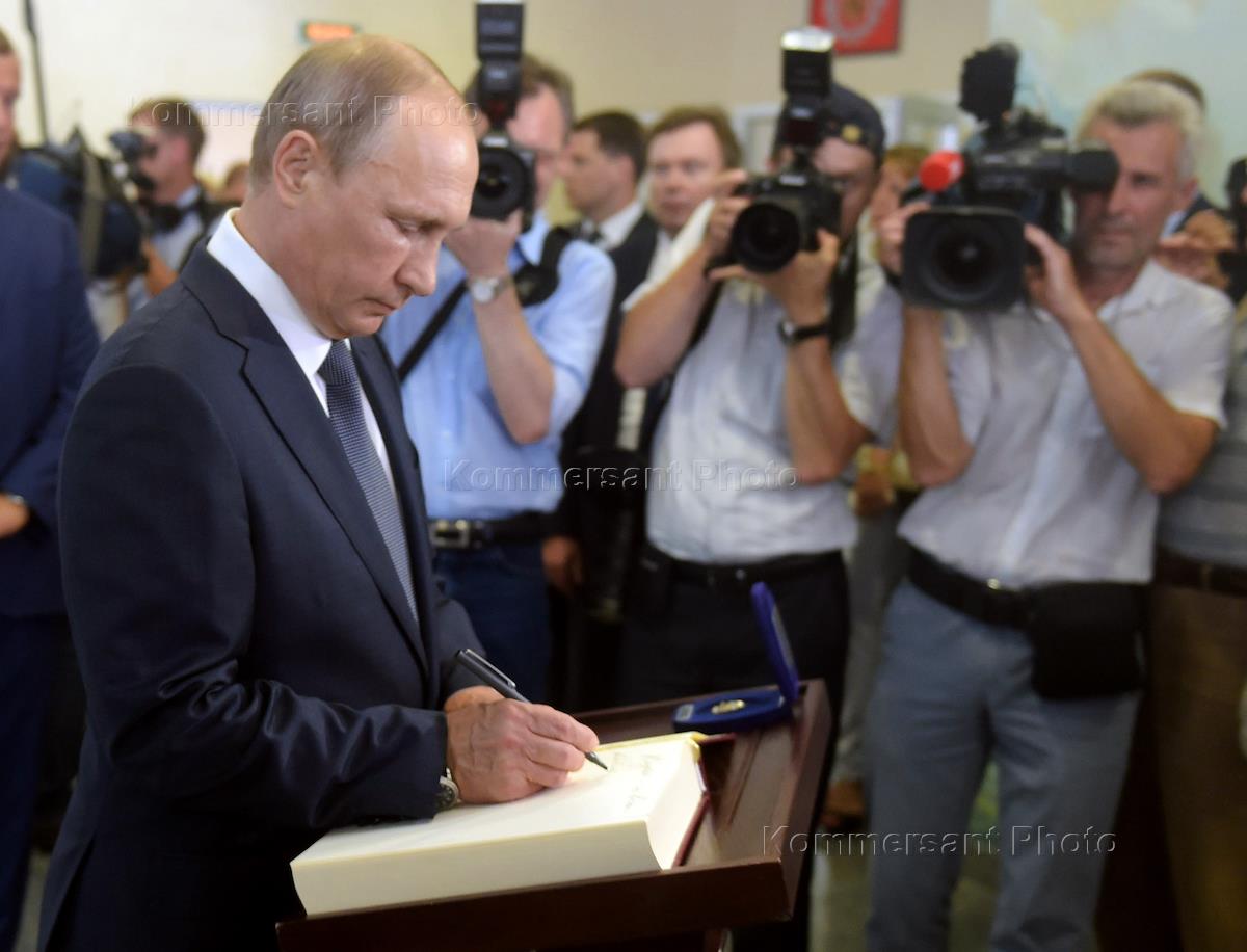 Рабочая поездка президента России Владимира Путина в Ялту. Президент России Владимир Путин (слева) во время посещения Севастопольского президентского кадетского училища.