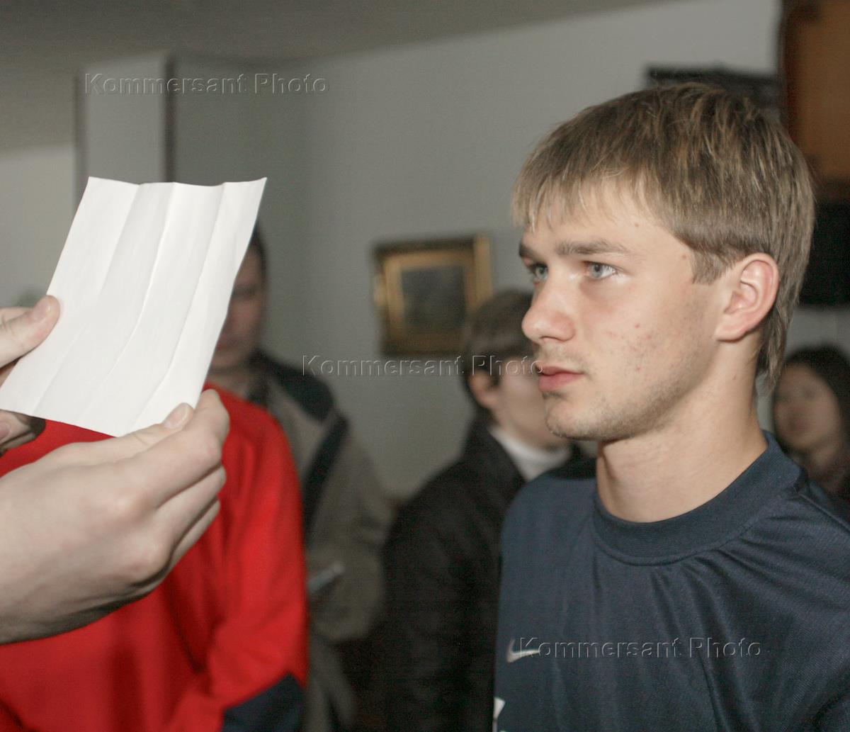 Russian football player Dmitry Sychev is interviewed at the news conference held on the Russian national football team training grounds outside Moscow.