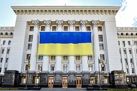 Празднование Дня Государственного Флага Украины. Cине-желтые флаги на окнах здания Администрации президента Украины.