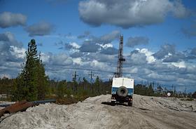 Жанровая фотография. Нефтяная вышка в тайге. Надпись на вывеске "Внимание! Действующие трубопроводы!".