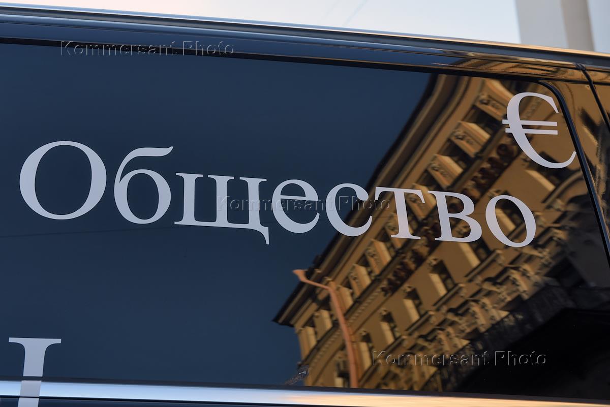 Жанровая фотография. Надпись на стекле автомобиля "Общество" и логотип евро.