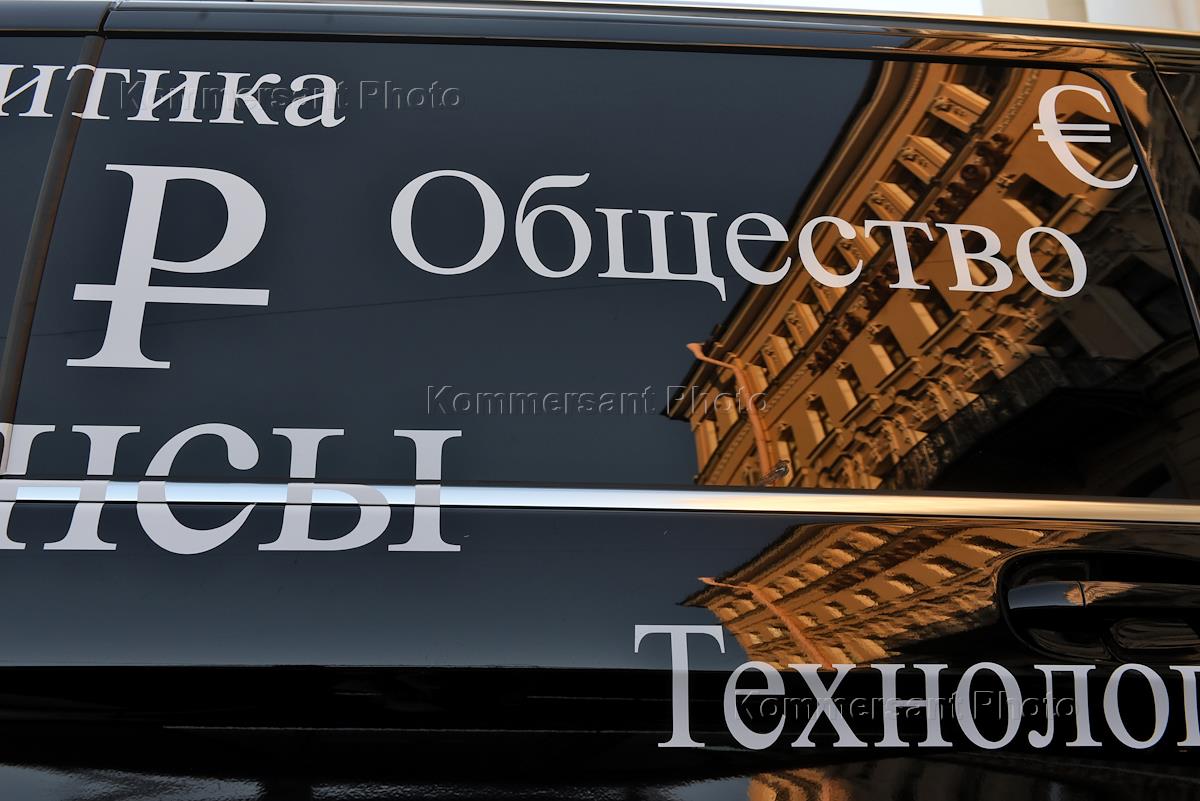Жанровая фотография. Автомобиль оклеенный надписями: "Бизнес, политика, общество, финансы, авто, технологии".