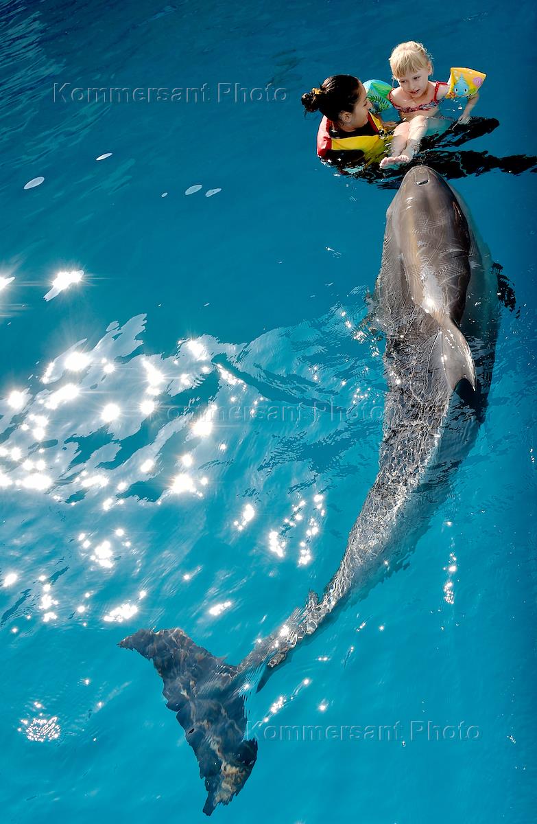 Жанровая фотография. Девушка-инструктор с ребенком плавают в бассейне с дельфином.