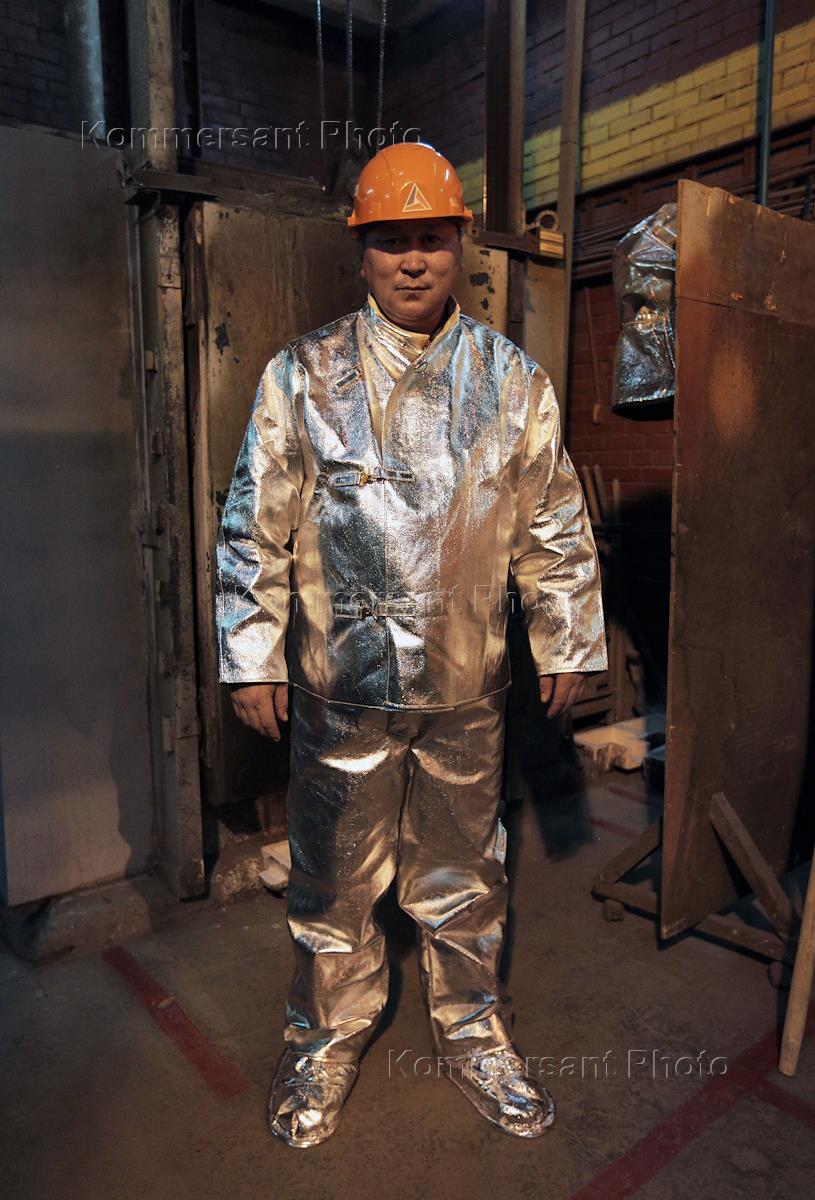 Жанровая фотография. Варваринское золоторудрое месторождение, принадлежащее МНПО "Полиметалл". Плавильщик золота в специальном костюме.