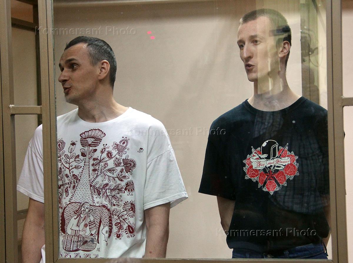 Украинский режиссер, руководитель подразделения "Правого сектора" в Крыму Олег Сенцов (слева) и член подразделения "Правого сектора" в Крыму Александр Кольченко (справа), обвиняемые в подготовке террактов в Крыму, во время заседания Северо-Кавказского окружного военного суда.