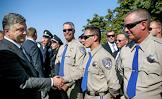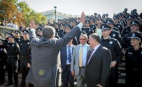 Рабочая поездка президента Украины Петра Порошенко в Одессу. Президент Украины Петр Порошенко (справа) после церемонии принесения присяги сотрудниками патрульной полиции.