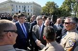 Рабочая поездка президента Украины Петра Порошенко в Одессу. Губернатор Одесской области Михаил Саакашвили (слева) и президент Украины Петр Порошенко (в центре) после церемонии принесения присяги сотрудниками патрульной полиции.