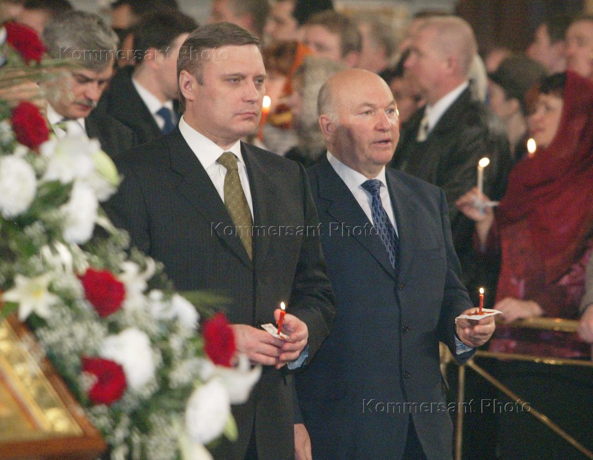 Russian Prime Minister Mikhail Kasyanov (left) and Moscow Mayor Yury Luzhkov (right) attend the Easter service in the Christ the Saviour Cathedral.