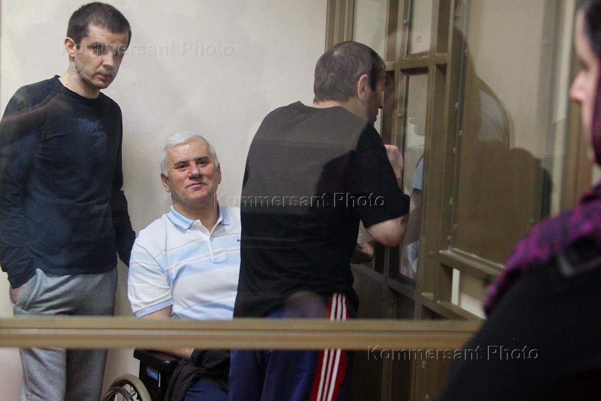 Бывший мэр Махачкалы Саид Амиров (второй справа), обвиняемый в убийстве своего политического оппонента, во время рассмотрения дела в Северо-Кавказском окружном военном суде.