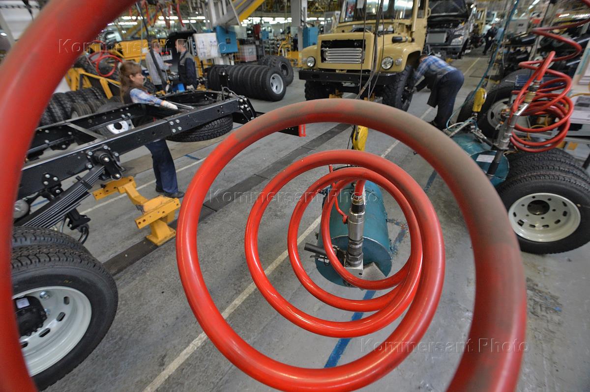 Group 'GAZ' (Gorky Automobile Plant). Assembly shop. Automobiles are on conveyors. Adjustment of carriage body.