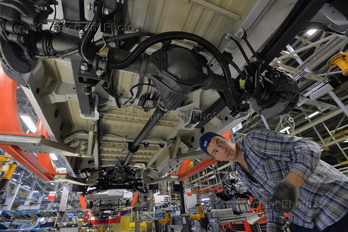 Group 'GAZ' (Gorky Automobile Plant). Assembly shop. Automobiles are on conveyors. Wheels alignment.