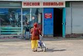 Жанрвоая фотография. Городской рынок. Мясной павильон. Продавщица курит в дверях павильона.