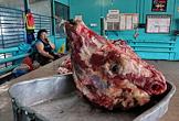 Жанровая фотография. Городской рынок. Мясной павильон. Торговля мясом. Коровья голова.