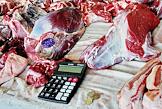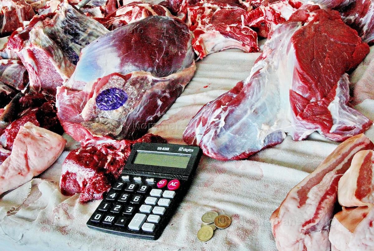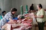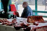 Жанровая фотография. Городской рынок. Мясной павильон. Торговля мясом. Цены.