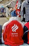 Жанровая фотография. Городской рынок. Торговля одеждой. Куртка с надписью Russian team.