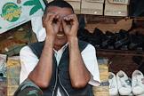 Жанровая фотография. Городской рынок. Продавец в павильоне по торговле обувью.