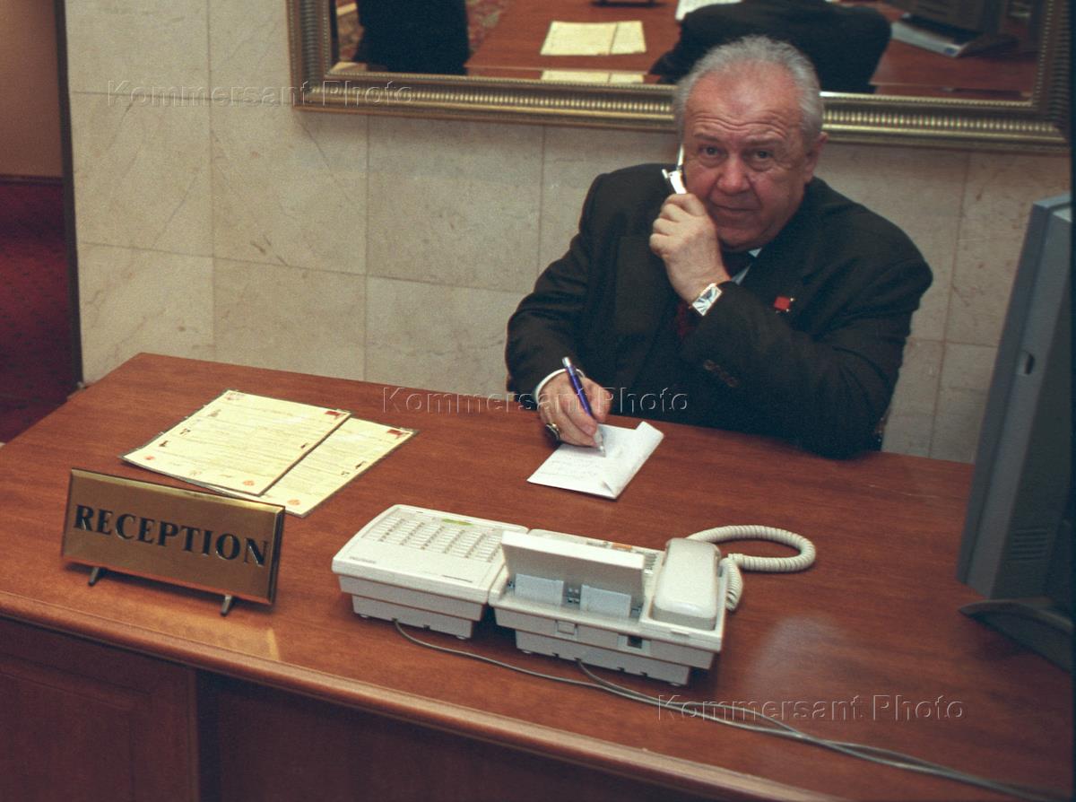 Chairman of the Russian State Sports Committee (Goskomsport) Vyacheslav Fetisov talks to the speaker of the Moscow city legislature Vladimir Platonov (right) at the opening party of the photographer Sergey Bermenyev's exhibition. The event took place in the Monolyt Club.