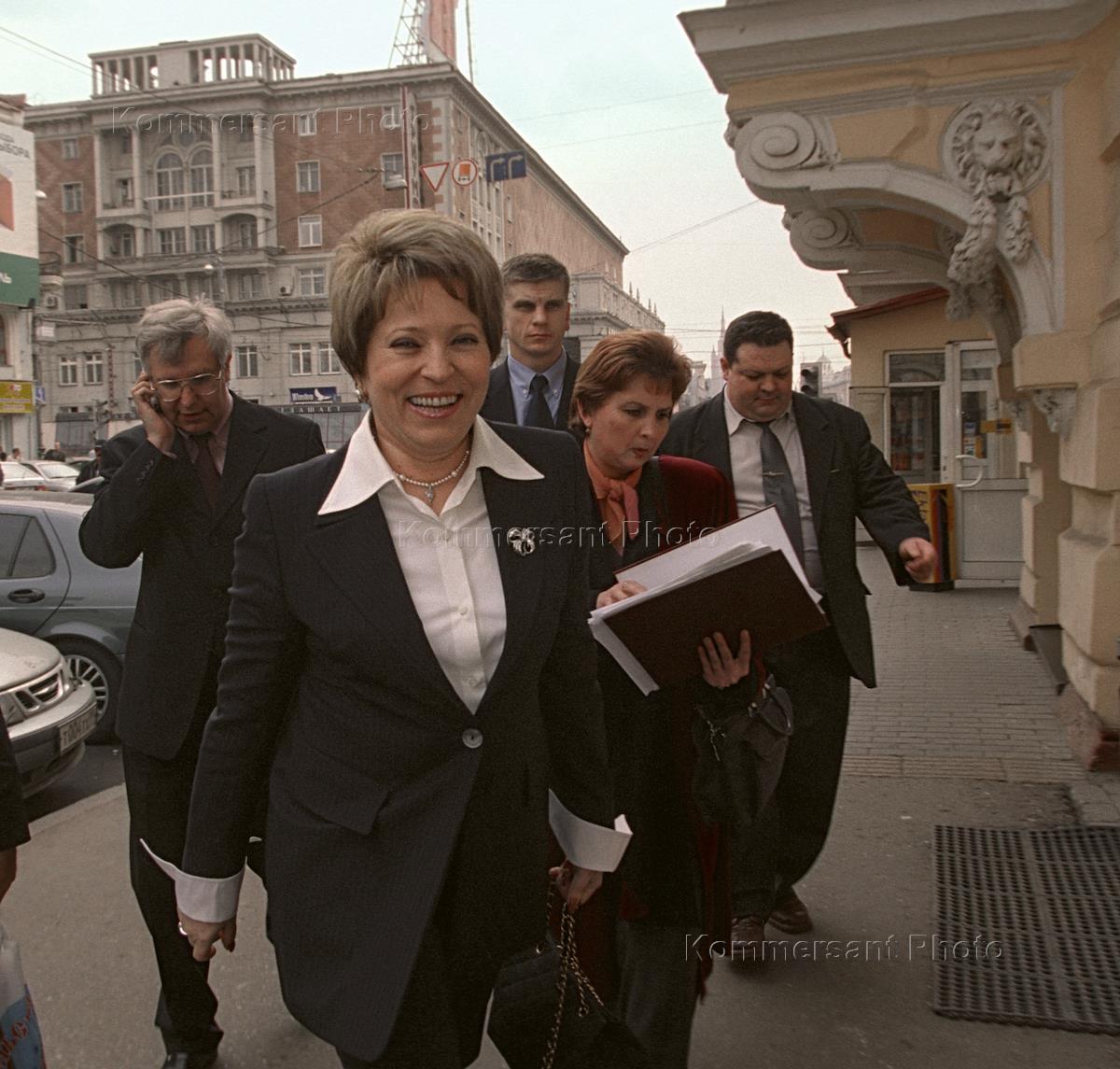 Russian presidential representative in the North-West Federal District Valentina Matviyenko arrives at the Interfax news agency headquarters to take part in a news conference.