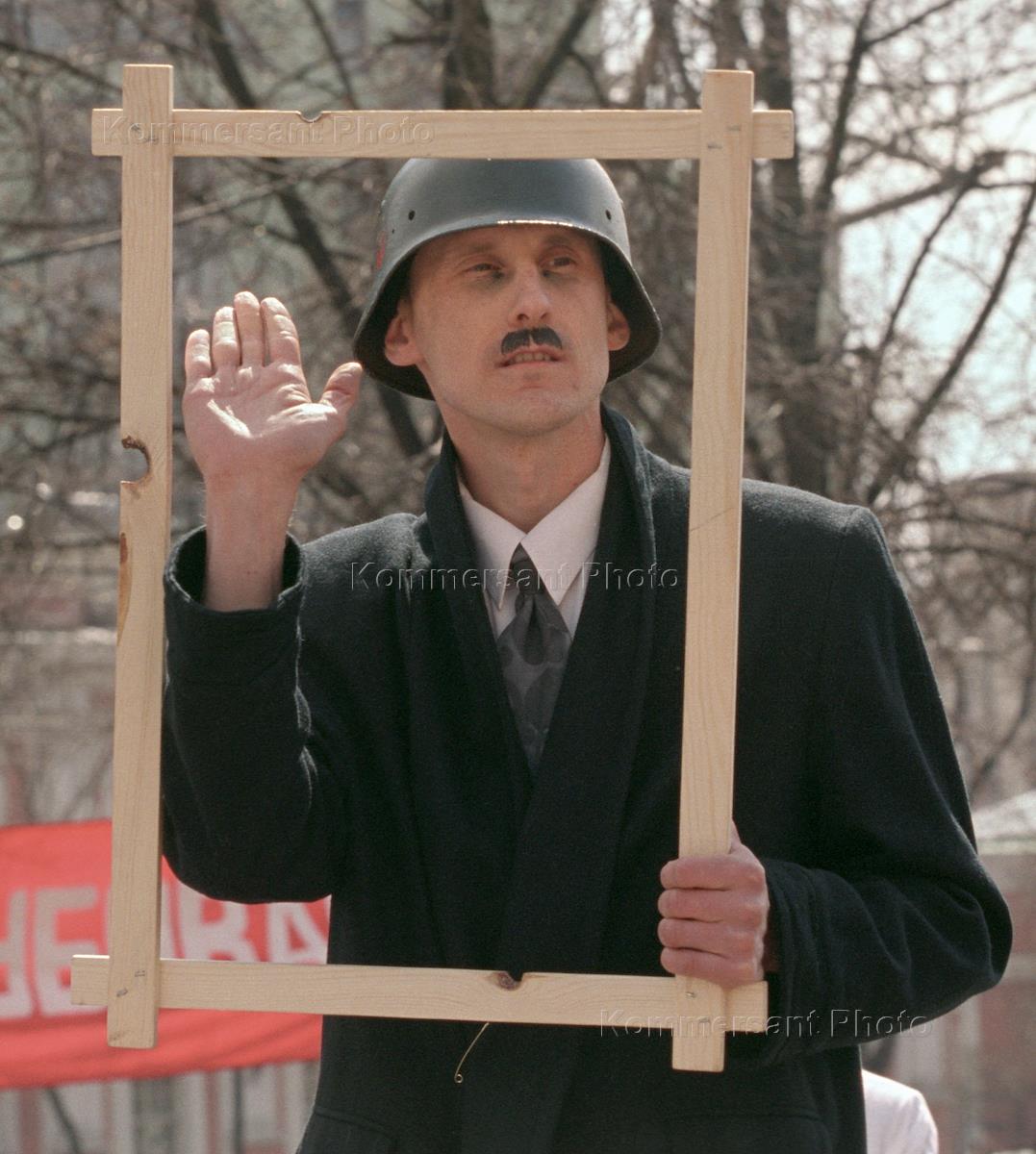 An unidentified participant of the rally staged to mark Adolf Hitler's birthday poses for a photo in the WW2 German-style military helmet.