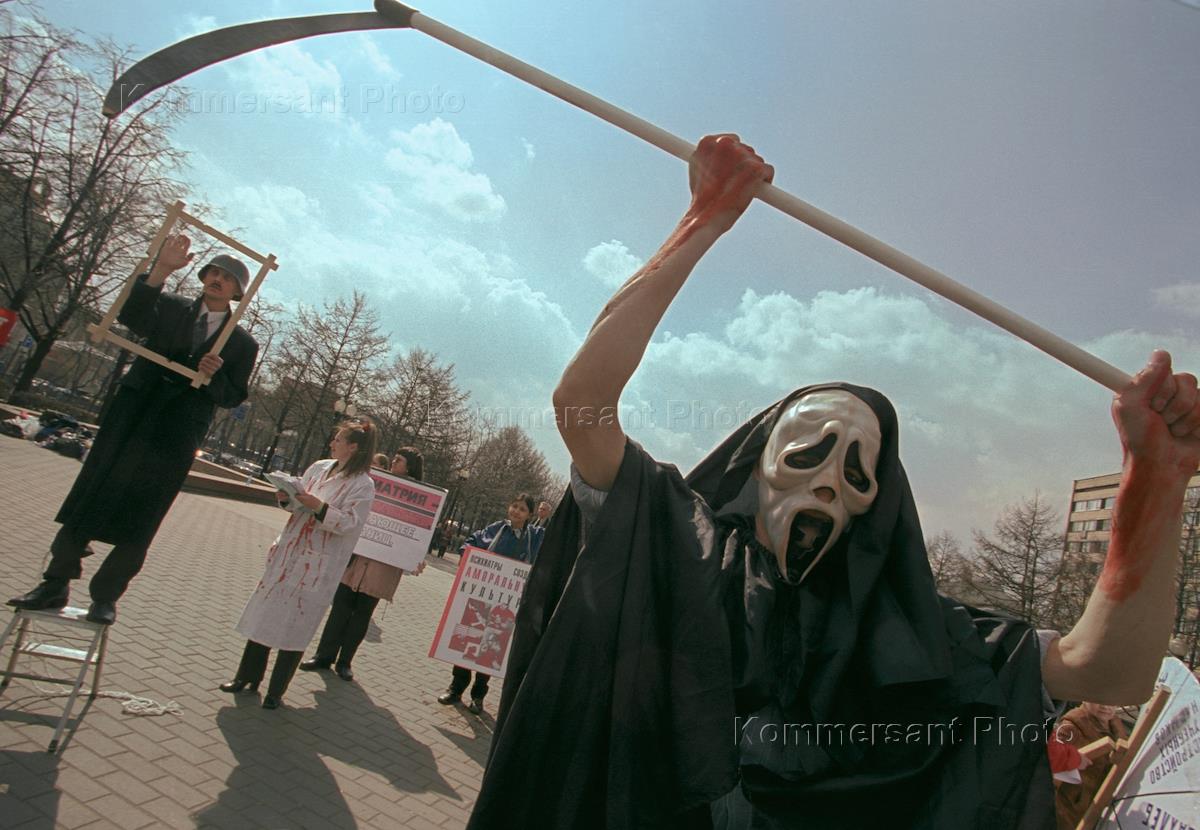 Человек в маске и костюме персонажа из фильма "Крик" - участник акции, приуроченной ко дню рождения Гитлера, на Пушкинской площади.
